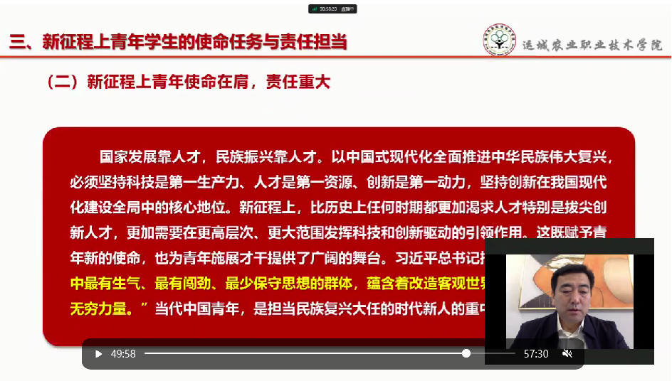 付宝春院长围绕党的二十大报告中“全面推进乡村振兴”这一重要论述,结合学院实际,从新时代十年乡村振兴的伟大变革,以中国式现代化要求推进“三农”新发展,新征程上青年学生的使命任务与责任担当三个方面为大家进行了全面深入的宣讲。