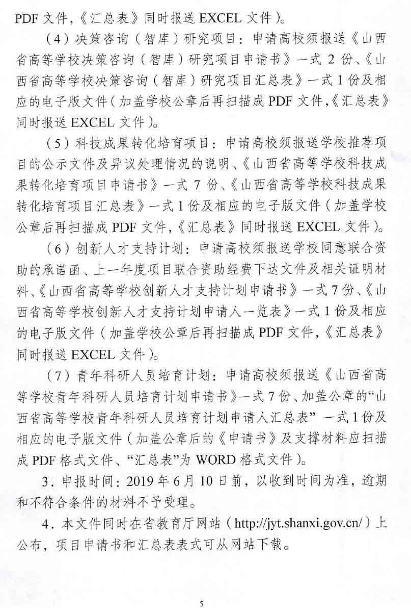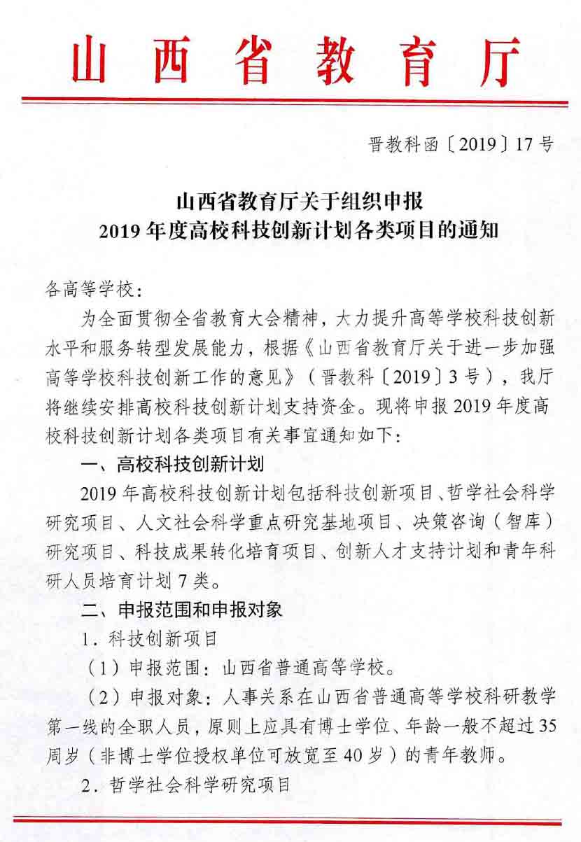 taptap点点科研中心协助山西省教育厅积极组织开展2019年度高校科技创新计划各类项目申报工作,具体参考科研中心网址(/index.php?m=content&c=index&a=show&catid=186&id=2922),各类项目申报时间在文件要求截至时间往前推7天作为taptap点点申报时间截至时间(科研中心需要富裕一定时间整理各项申报材料),对于电子版本发送到科研中心邮箱(ycnxykyzx@126.com),纸质版或光盘按文件要求,多准备一份(科研中心留存用),交科研中心。本信息在学院科研中心网,人事QQ群,学院微信群,同时发布,不另行通知。