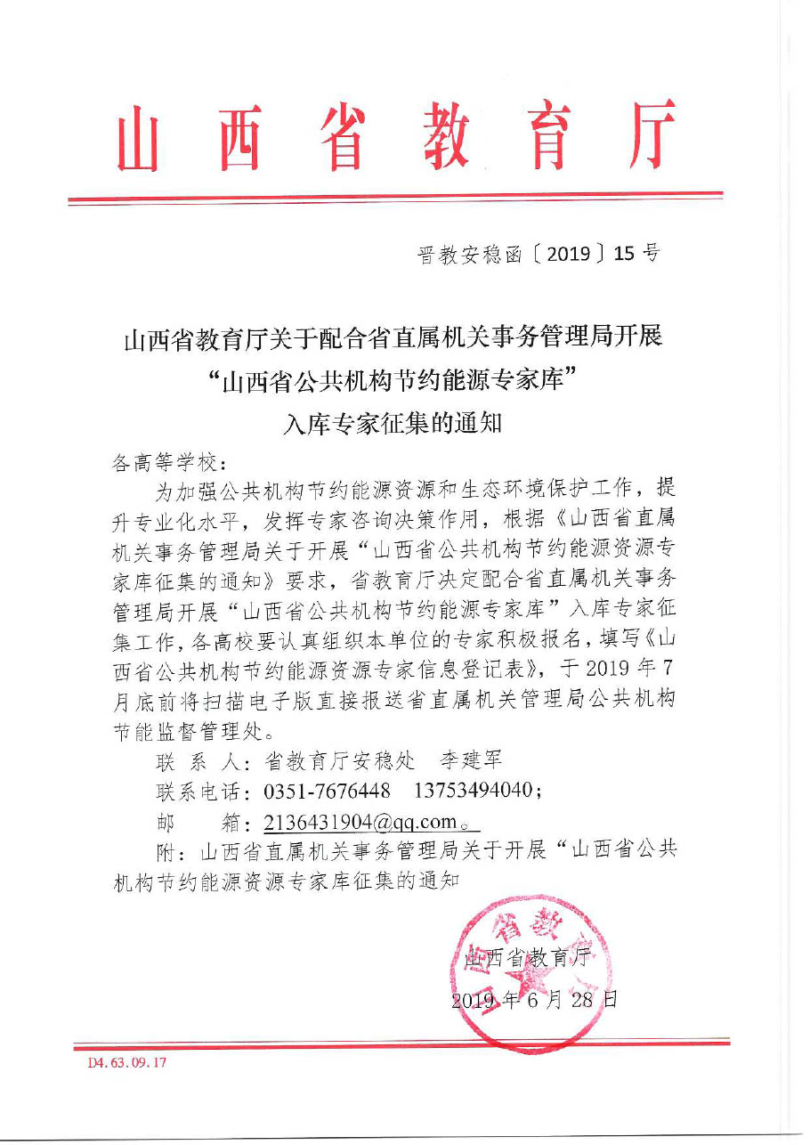 山西省教育厅关于配合省直属机关事务管理局开展“山西省公共机构节约能源专家库”入库专家征集的的工作。taptap点点积极配合申报,请符合文件条件的教工(参看科研中心发布的文件/index.php?m=content&c=index&a=show&catid=186&id=3087),将申报材料于7月28日前, 交于科研中心(申报材料比文件要求多准备一份,科研中心留存用),本信息在人事QQ群、学院微信群、科研中心网同时公布不另行通知。