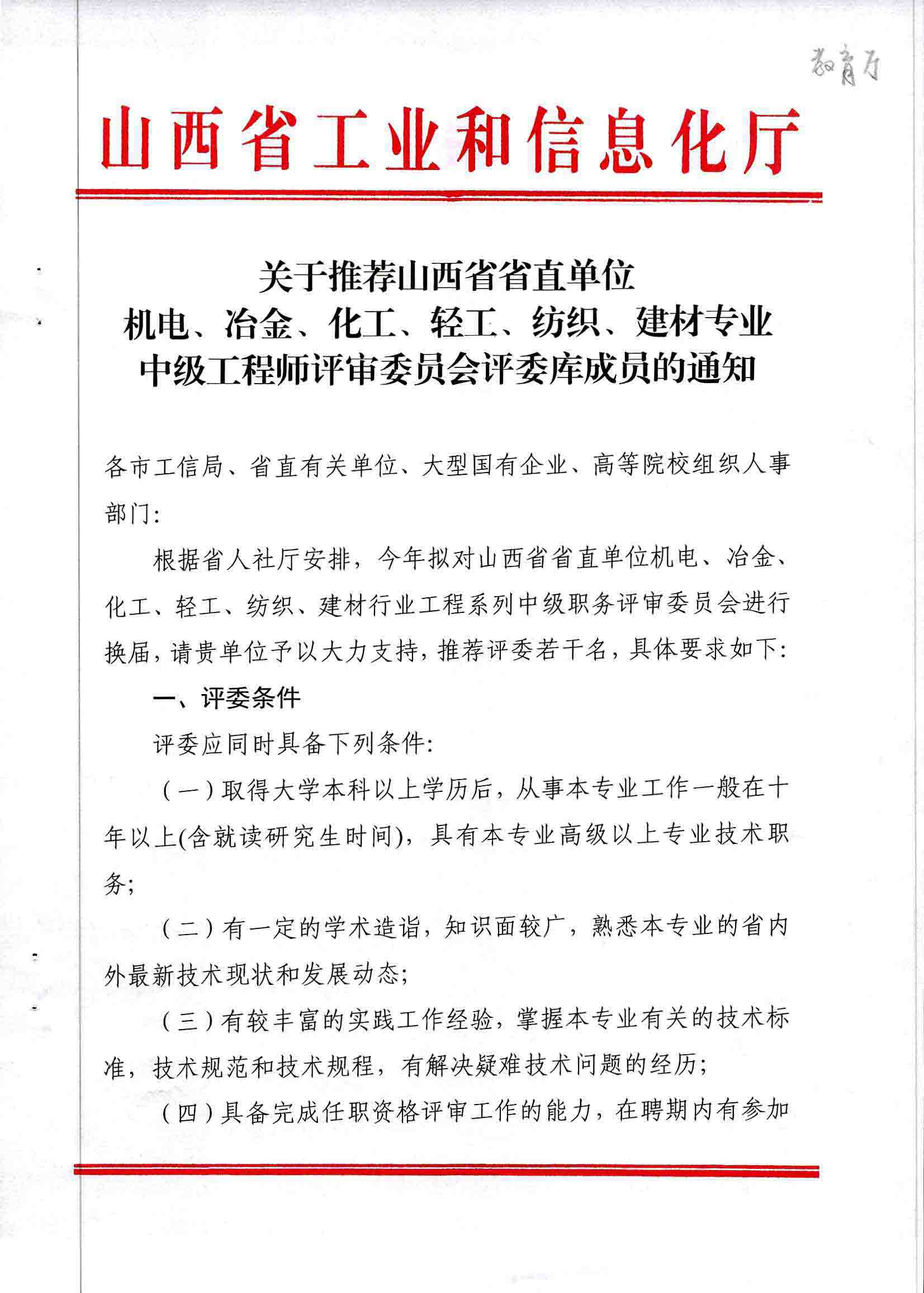 taptap点点配合山西省工信厅人事教育处,积极开展推荐山西省省直单位机电、冶金、化工、轻工、纺织、建材专业中级工程师评审委员会评委库成员工作,阅读科研中心网站(/index.php?m=content&c=index&a=show&catid=186&id=3222)信息后,符合条件的教工,按文件要求填表申报,比文件要求多准备一份材料交科研中心留存。本信息在科研中心网,学院微信群,人事QQ群同时发布,不另行通知。