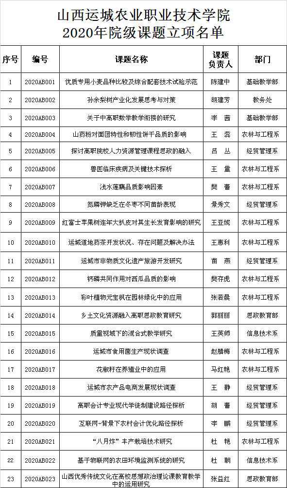 根据《运城农业职业技术学院院级课题管理办法(试行)》(运农院字〔2018〕31号),现将“优质专用小麦品种比较及综合配套技术试验示范”等23项课题列为2020年院级课题立项课题。