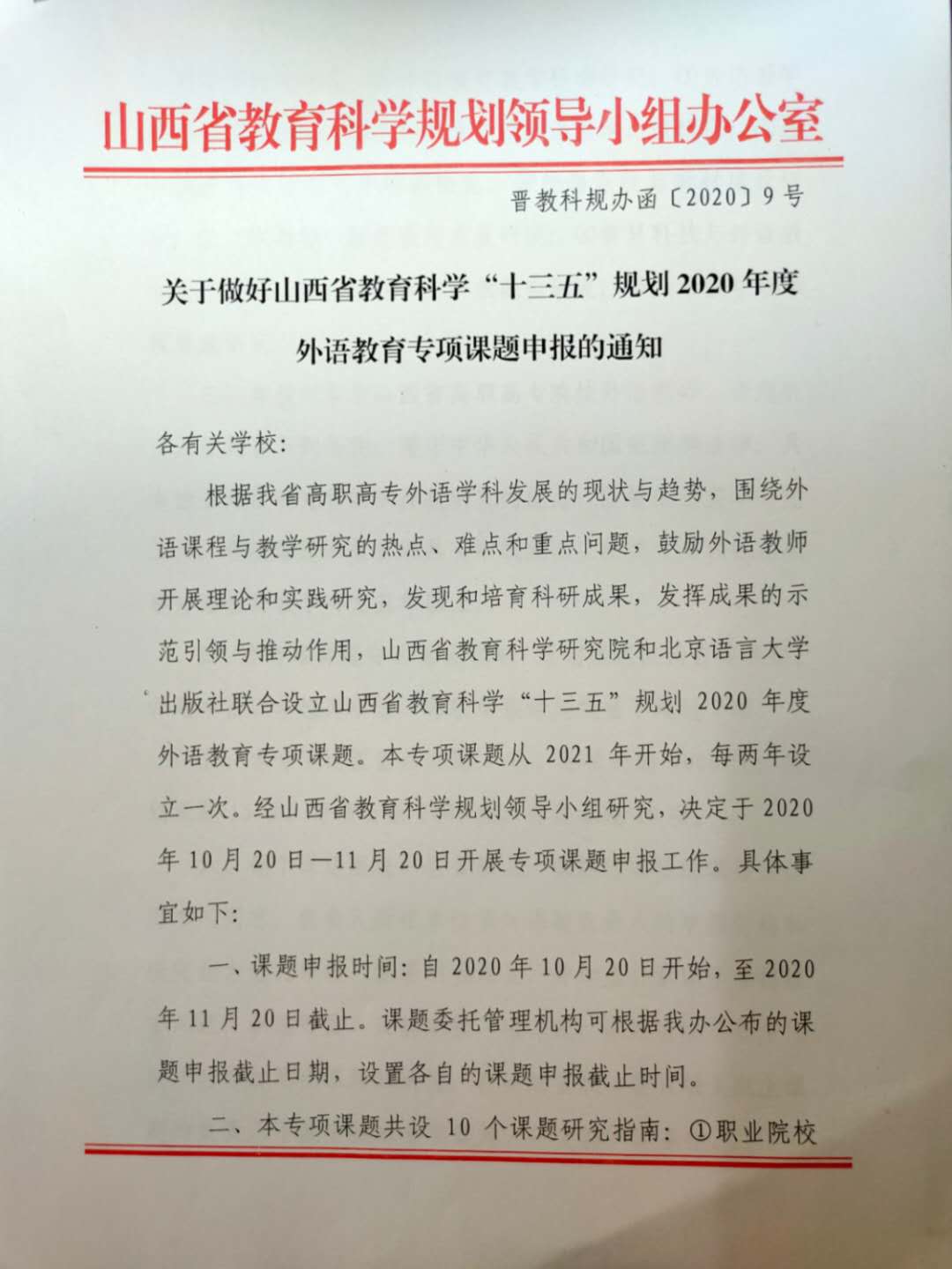 根据我省高职高专外语学科发展的现状和趋势,围绕外语课程与教学研究的热点、难点和重点问题,鼓励外语教师开展理论和实践研究,山西省教育科学研究院和北京语言大学出版社联合设立山西省教育科学“十三五”规划2020年度外语教育专项课题。请符合条件的教职员工积极申报,截止日期为11月20日,具体通知如下: