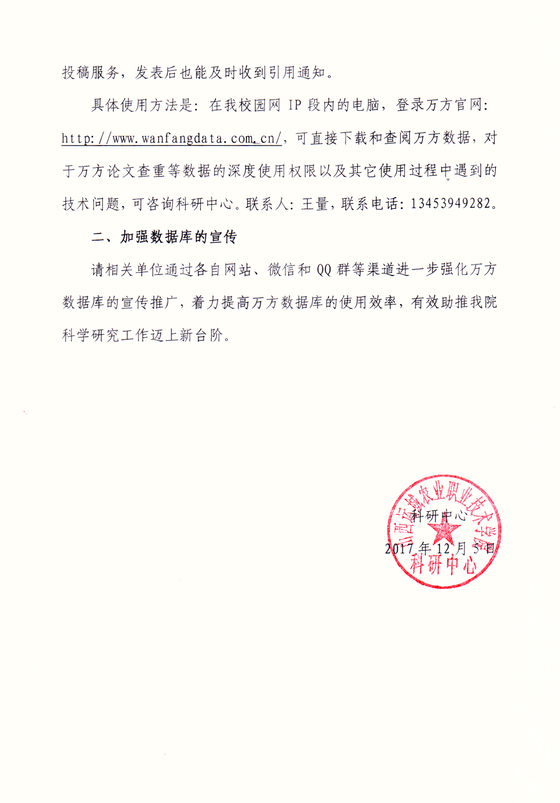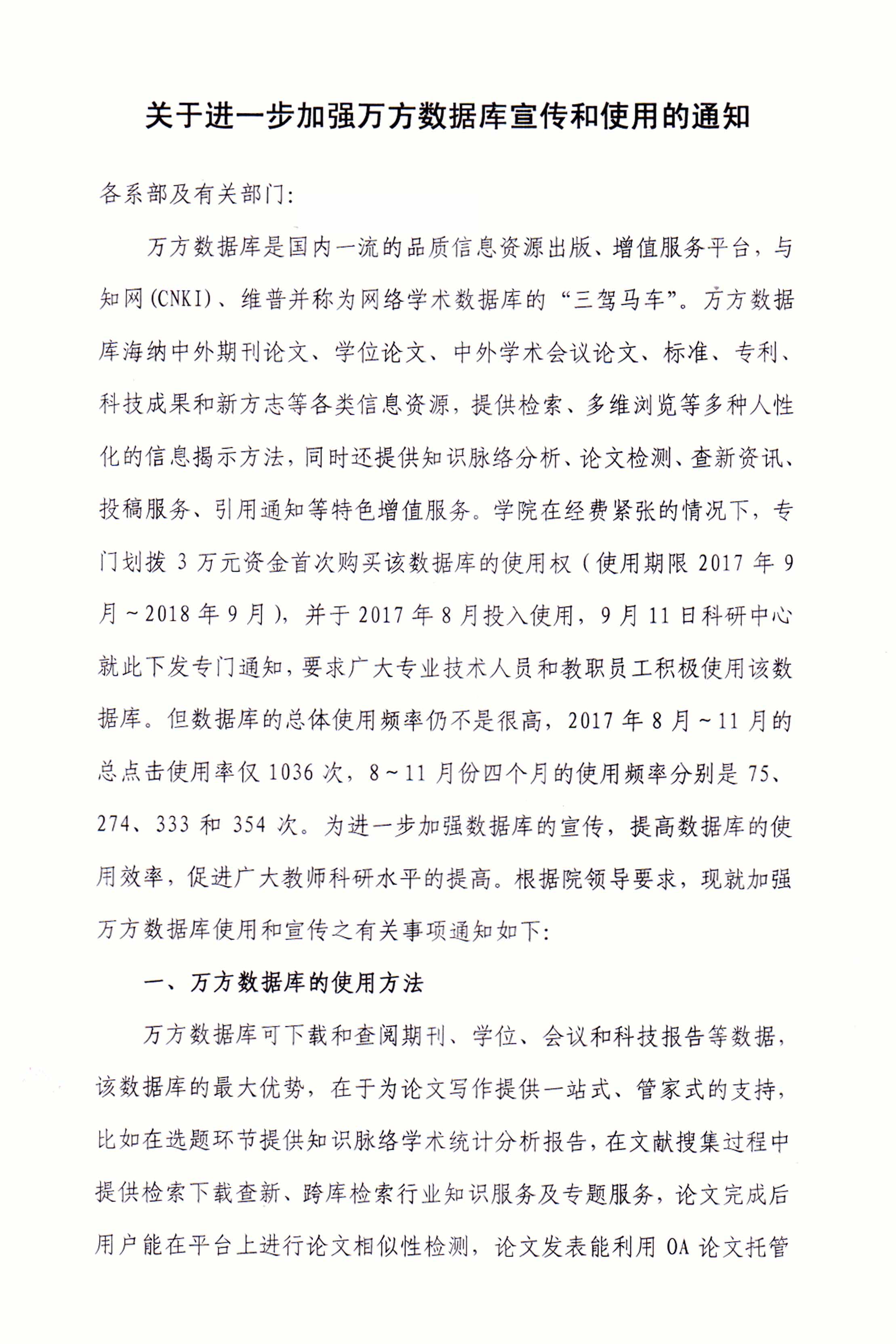 关于进一步加强万方数据库宣传和使用的通知