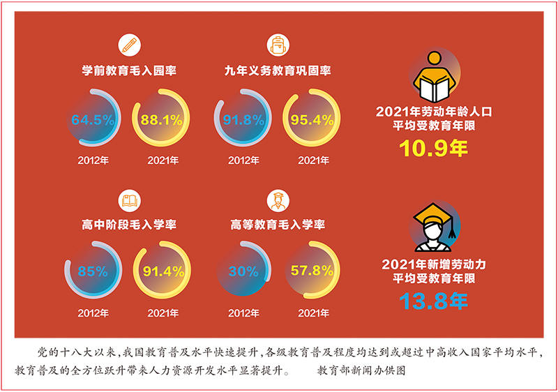 党的十八大以来,我国教育普及水平快速提升。截至2021年,全国共有各级各类学校52.93万所,在校生2.91亿人,专任教师1844.37万人。各级教育普及程度均达到或超过中高收入国家平均水平,其中,学前教育、义务教育普及程度达到世界高收入国家平均水平,高等教育进入国际公认的普及化阶段,教育总体发展水平跃居世界中上行列。推进学前教育普及普惠,学前教育毛入园率达到88.1%,比2012年提高23.6个百分点。加快义务教育均衡发展和城乡一体化,九年义务教育巩固率达到95.4%,比2012年提高3.6个百分点。推进高中阶段教育普及攻坚,高中阶段毛入学率达到91.4%,比2012年提高6.4个百分点。推动高等教育内涵式发展,高等教育毛入学率达到57.8%,比2012年提高27.8个百分点。教育普及的全方位跃升带来人力资源开发水平显著提升,我国劳动年龄人口平均受教育年限达到10.9年,新增劳动力平均受教育年限达到13.8年,拥有大学文化程度的人口超过2.18亿,劳动力素质结构发生重大变化,全民族素质极大提高。站在新的历史起点上,我们要着力促进各级各类教育协调发展,在固根基、扬优势、补短板、强弱项上下功夫,持续扩大优质教育资源供给,不断提升全民受教育程度。