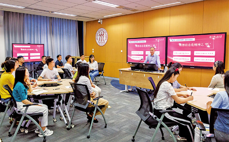 教育系统扎实推进习近平新时代中国特色社会主义思想进教材进课堂进头脑,学校思想政治理论课改革创新成效显著,“大思政课”建设全面推进。图为2022年6月11日,中国人民大学“习近平新时代中国特色社会主义思想概论”课堂。中国人民大学供图