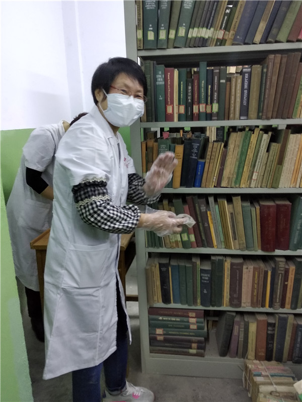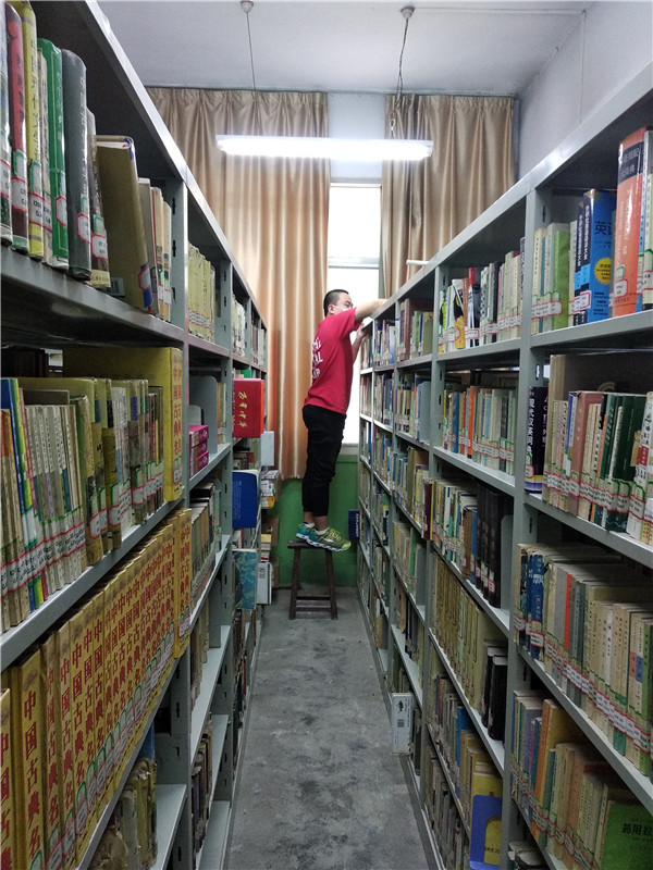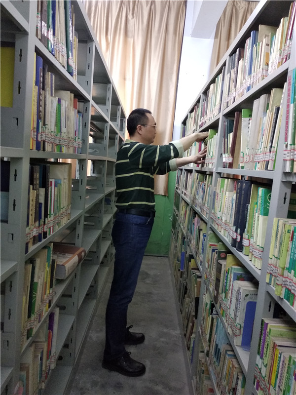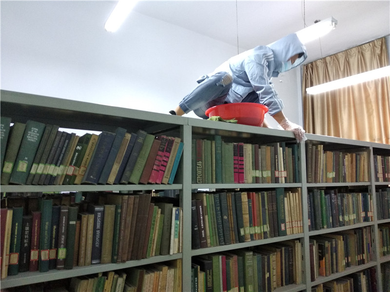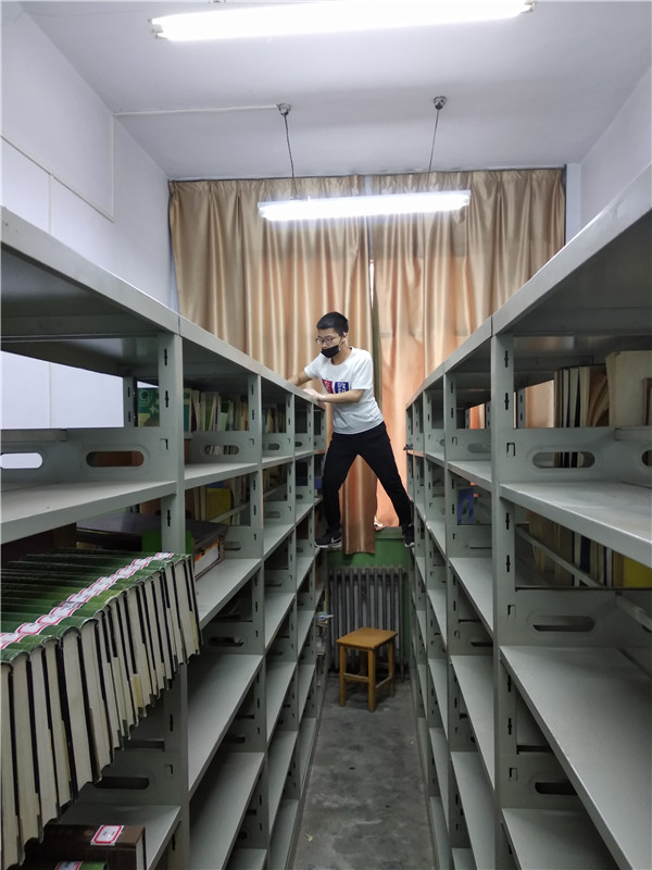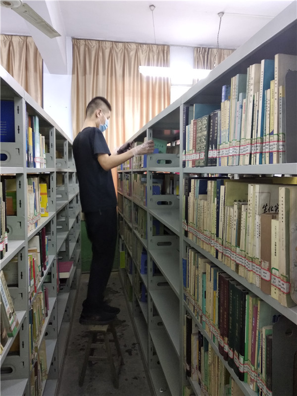 2019年5月13日,图书馆工作人员对外文书籍、工具书籍进行移库倒架整理工作。