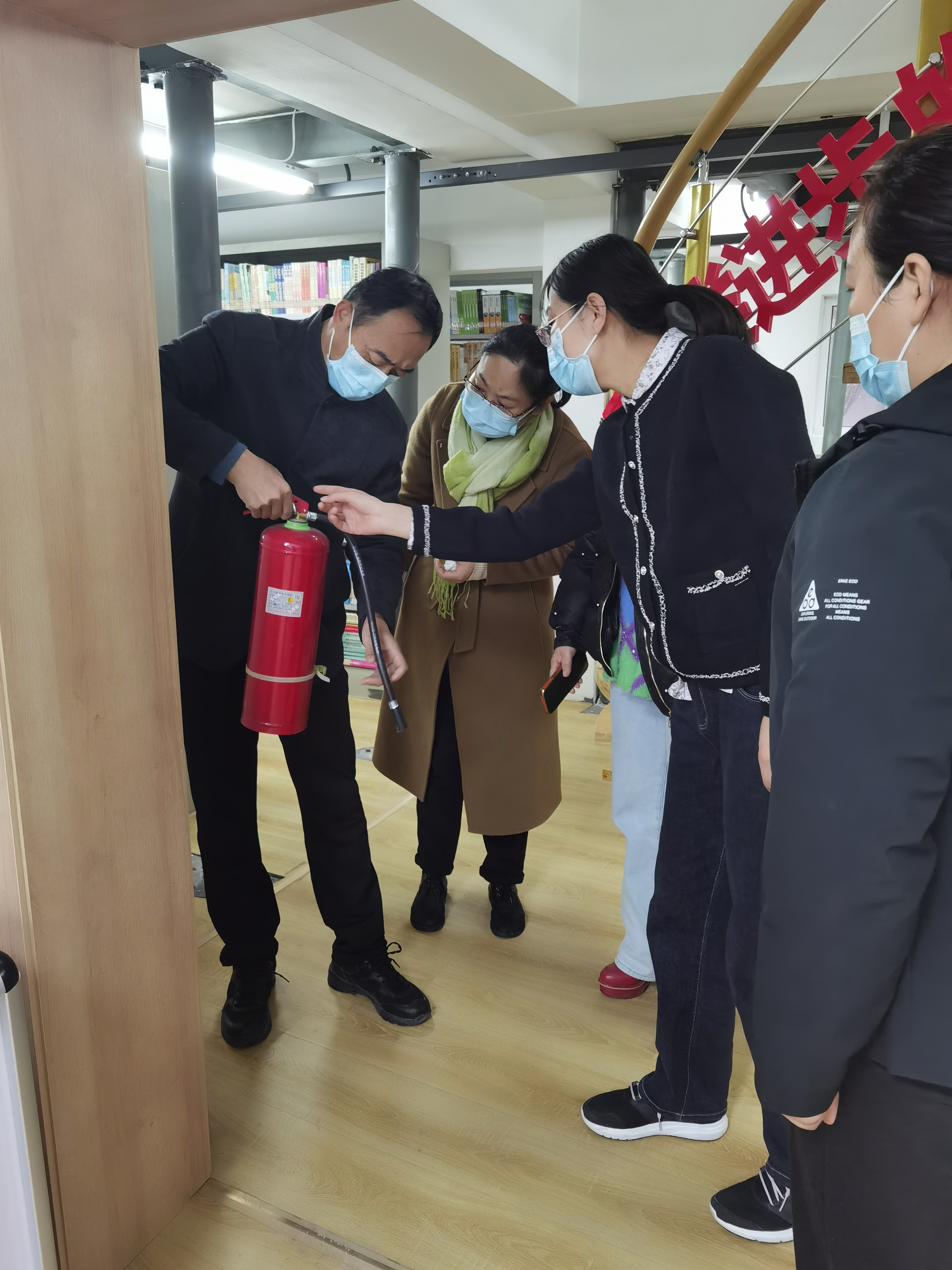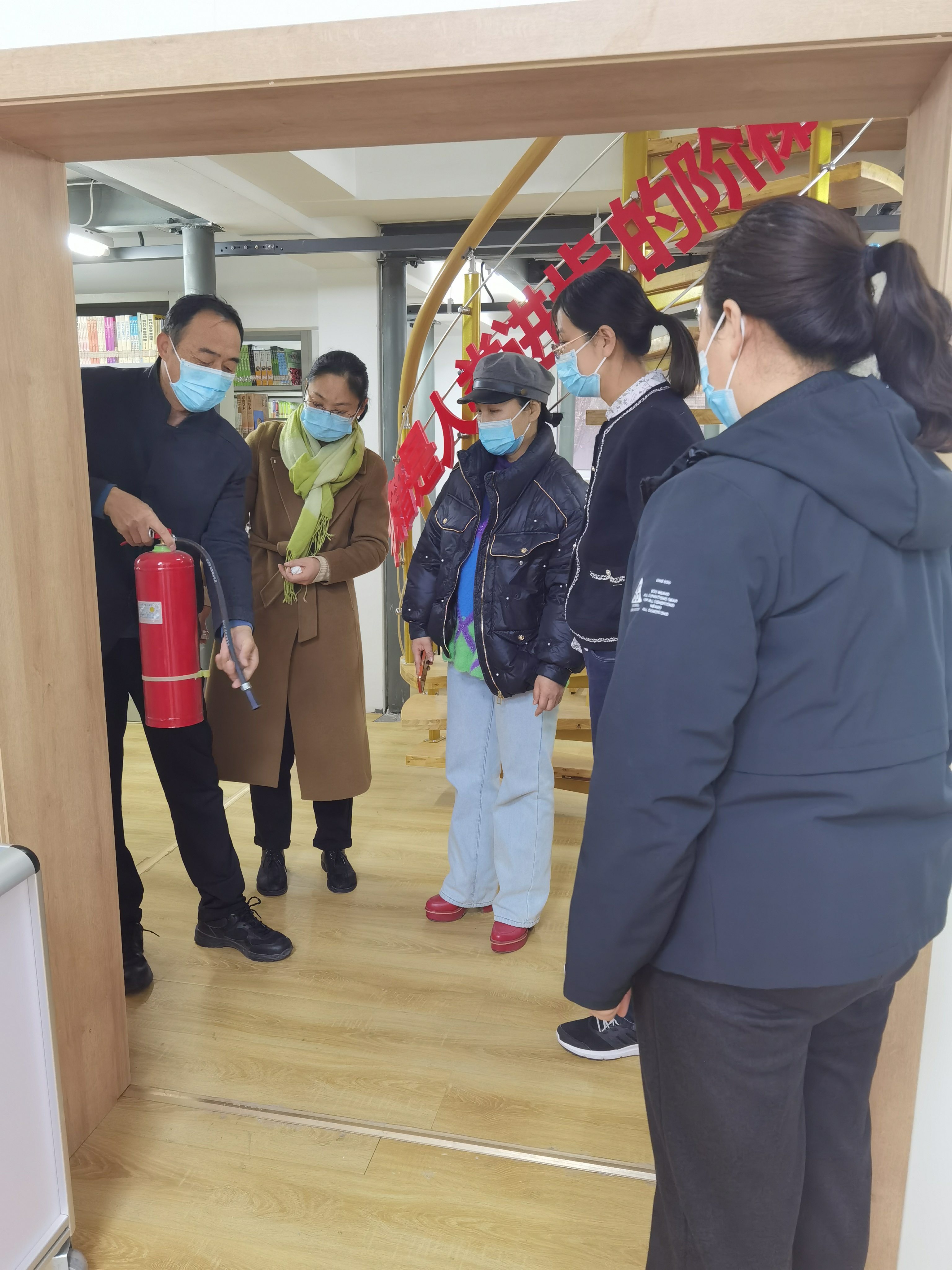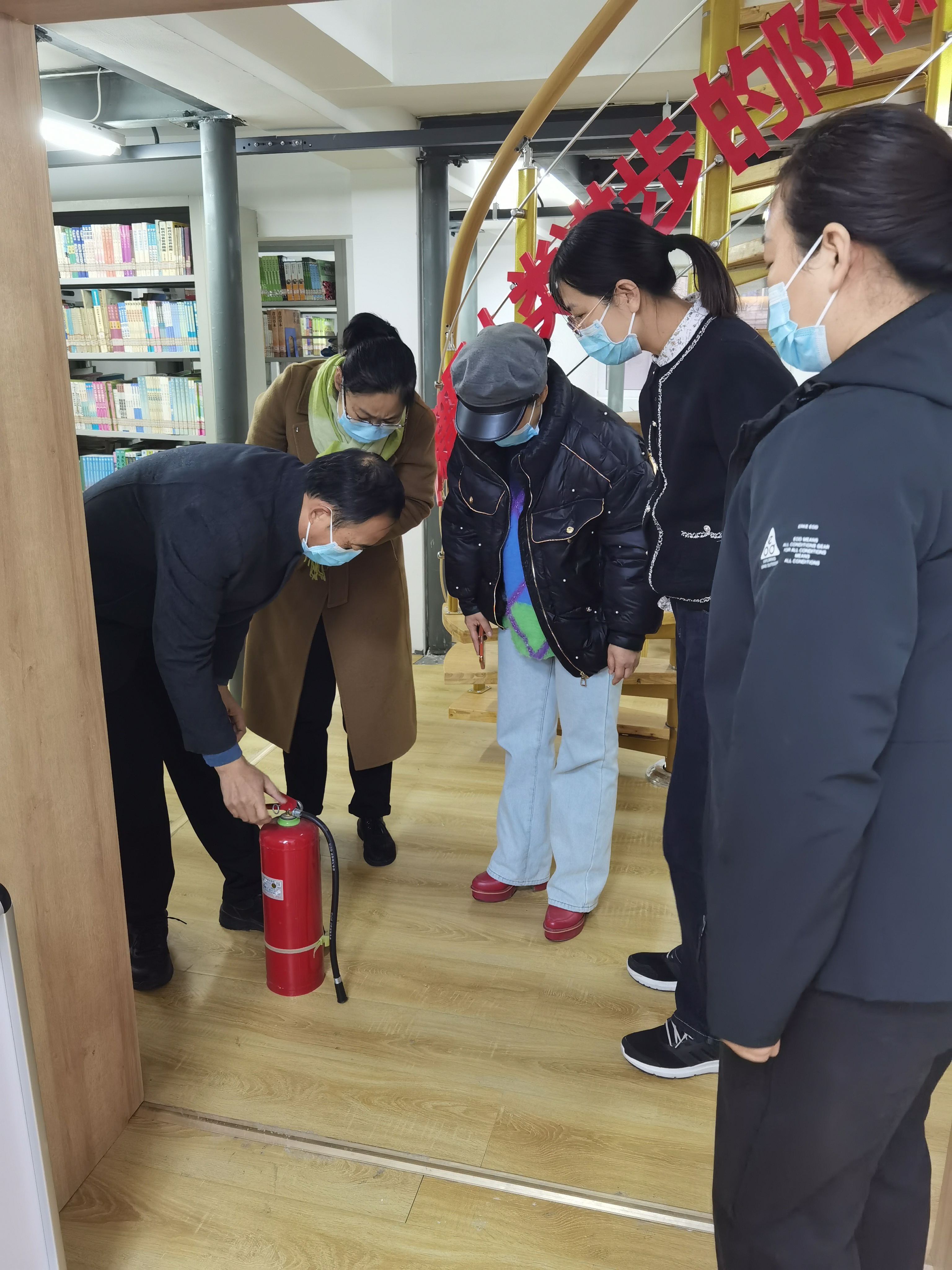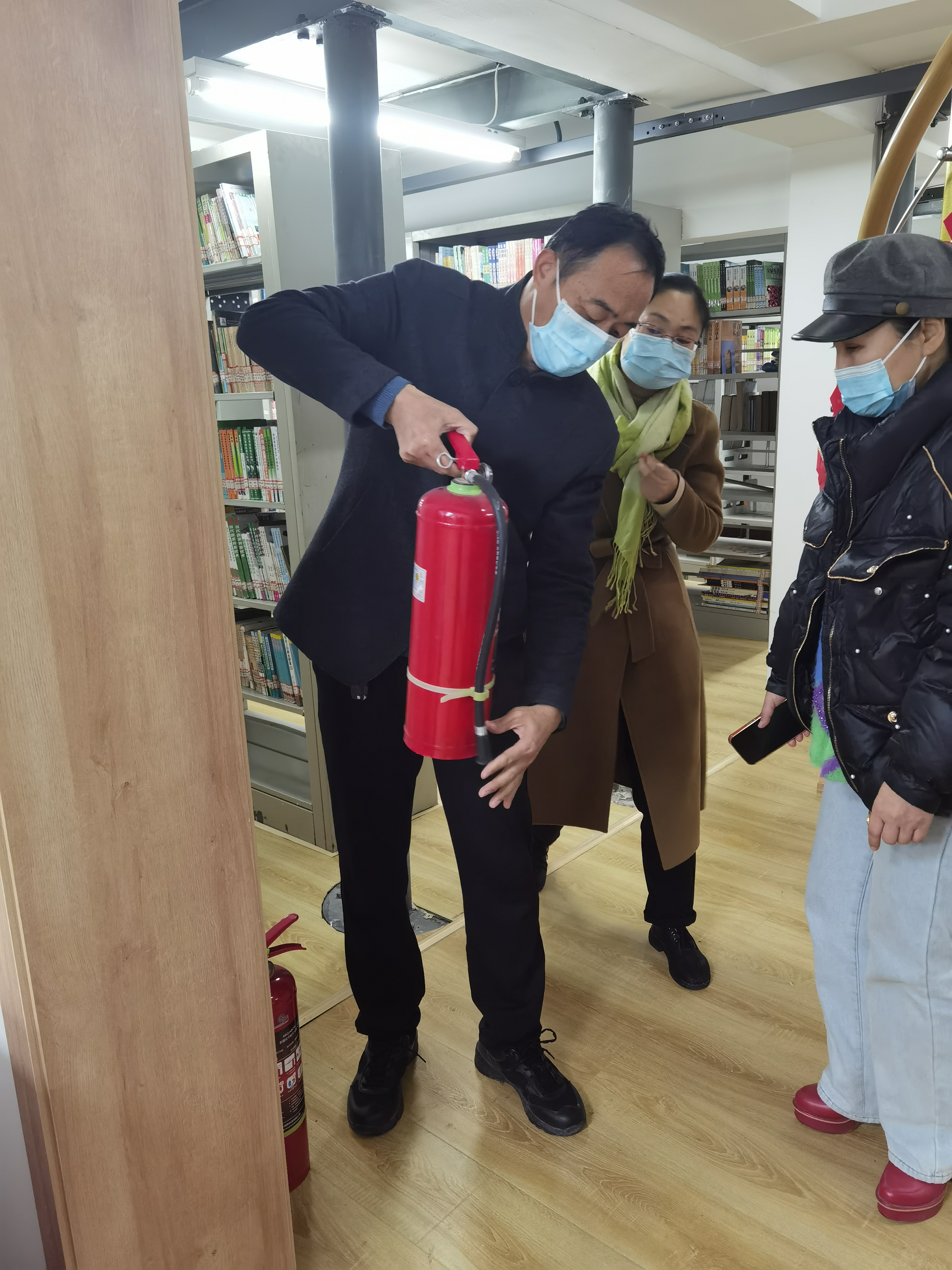 11月23日,图书馆全体工作人员在贾晓霞馆长的带领下,由负责安全工作的王博副馆长进行安全消防器材的熟悉和演练。