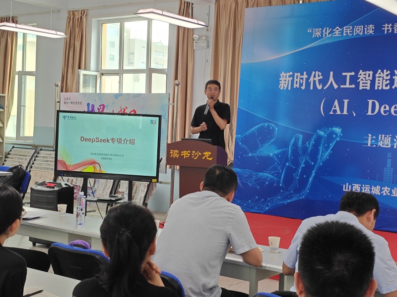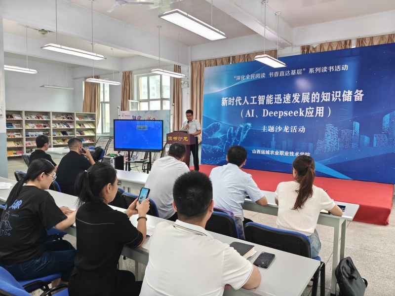 5月30日下午,图书馆在三楼阅览室举办了以“新时代人工智能迅速发展的知识储备”为主题的读书沙龙活动。由付利军副教授主持,特邀中国电信集团一级技术专家高级研发工程师任俊萍、山西移动公司移动云售前产品经理郝鸿、信息技术系专业讲师赵江河和许坚老师为大家重点介绍AI发展与Deepseek的具体应用,各系部负责人、教师和学生80余人参加了本次沙龙活动。