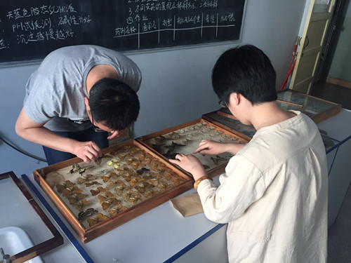 5月9日,电教实训中心郭震宇、张奂等老师为“文明校园”活动的标本展做准备,给昆虫标本换药水、换标签、整理,以达到观看的最佳效果。