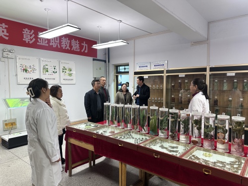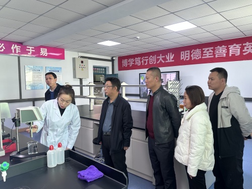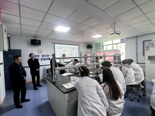 苗祥义副校长一行人先后参观了动物疫病实验室、动物标本室、微生物实训室、植物标本室、植物病虫害防治实训室和食品理化检测实训室,详细了解各实训室教学功能和实习实训设计。在食品理化检测实训室,薛晓强、李媛老师现场进行果汁粘度的检测实验。