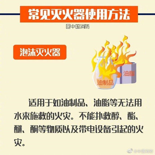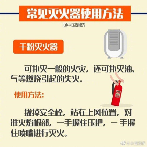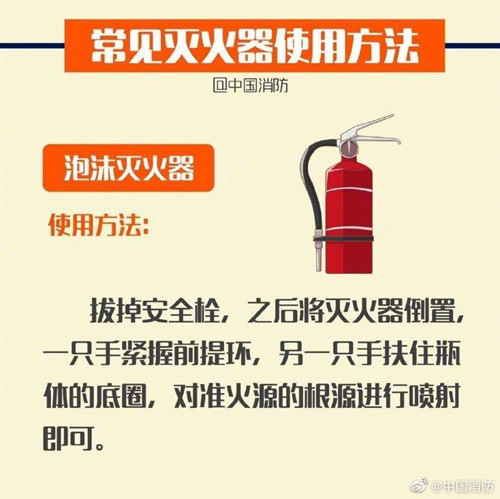 灭火器是一种可携式灭火工具,是常见的防火设施之一。轻松4步完美掌握灭火器:提、拔、握、压。提——提起灭火器;拔——拔掉保险销;握——握住喷嘴;压——站在上风口,保持适当距离,压下压把,对准火焰根部喷射灭火,直至火焰熄灭。