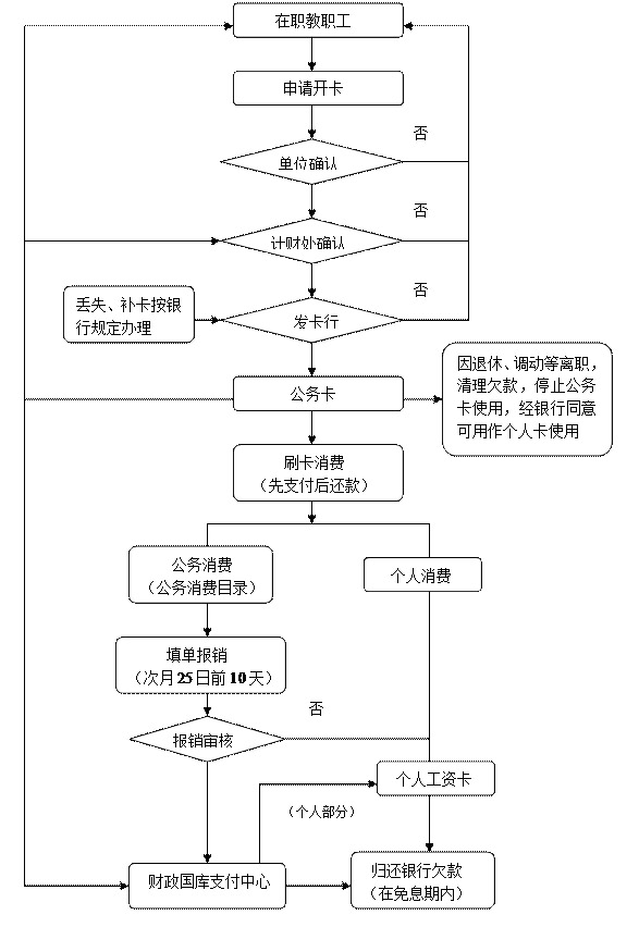 第六条 公务卡具有26-56天的透支免息期。按照银行规定,最迟还款日为:透支刷卡后应在次月25日之前还款(不含25日)。使用公务卡办理公务支出的支付结算业务,要及时到计财处办理报销手续,归还公务卡的银行欠款。使用公务卡办理个人支出的支付结算业务,计财处不予办理报销,由个人及时归还公务卡的银行欠款,不及时办理报销公务支出或属于个人消费支付行为的,造成的损失均由个人承担。