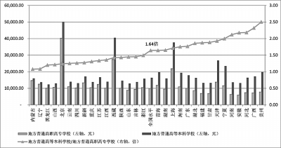 高职院校生均公共财政预算教育经费支出增长明显,但与本科院校相比,各地政府对高职教育的财政保障力度仍然偏弱。从全国整体来看,2013年地方普通本科学校的生均公共财政预算教育经费支出为16388.57元,是地方高职院校9976.97元的1.64倍。差距最小的是内蒙古和辽宁,约1.08倍;差距在2倍以上的地区有6个,分别是宁夏、河南、安徽、河北、广西和贵州,贵州省的差距最大,达到2.5倍(见图1)。
