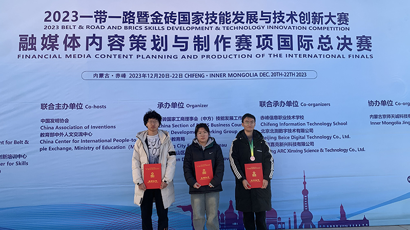 2023年12月21日,taptap点点信息技术系在2023一带一路暨金砖国家技能发展与技术创新大赛之融媒体内容策划与制作赛项国际总决赛中,荣获三等奖一项,3名参赛选手分别为王晨阳、王涛和李文佳,系部指导老师分别为付利军和乔琴艳。