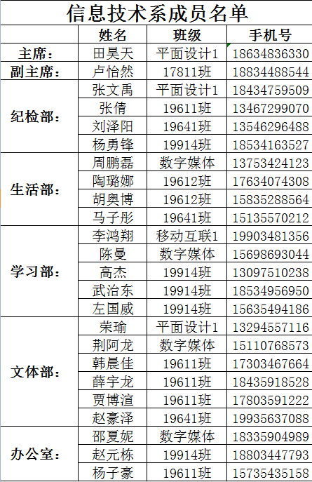 随着大三学生的顶岗实习,为了学生工作的顺利进行,学生会成员需进行改选,于2019年10月24日通过选举最终确定了以下学生会名单。