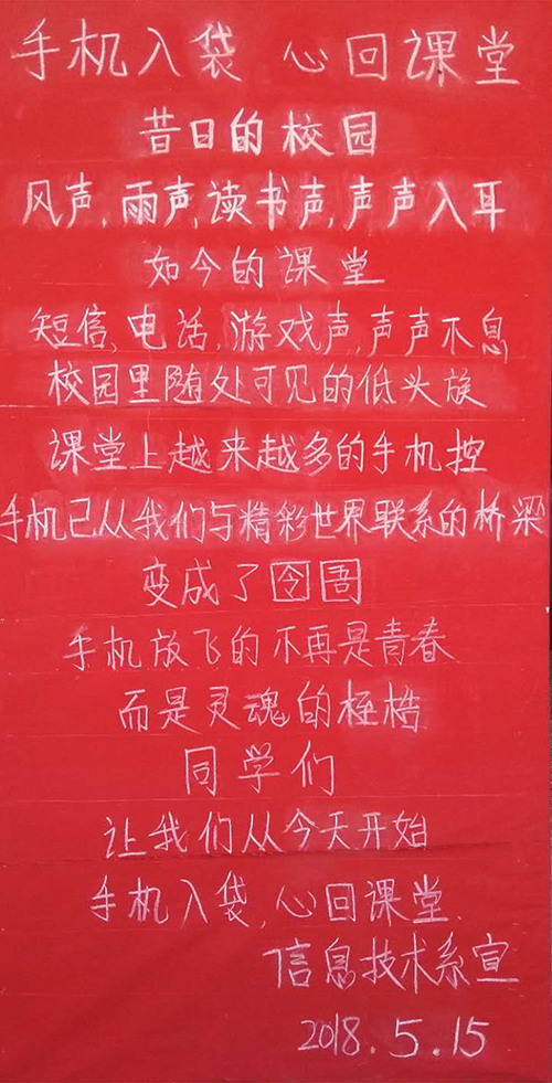 2018年5月15日早上9点50分课间操时间,我系所有学生、系部教师以及各班班主任在教学楼前举行了“手机入袋,心回课堂”行动的启动仪式。首先由学生干部代表宣读倡议书,随后由学生会干部宣读了《信息技术系课堂手机使用管理规定》,然后由学生代表发言,表达了坚决支持此行活动的决心,最后由信息技术系王英师主任致辞,对此次活动进行总结。