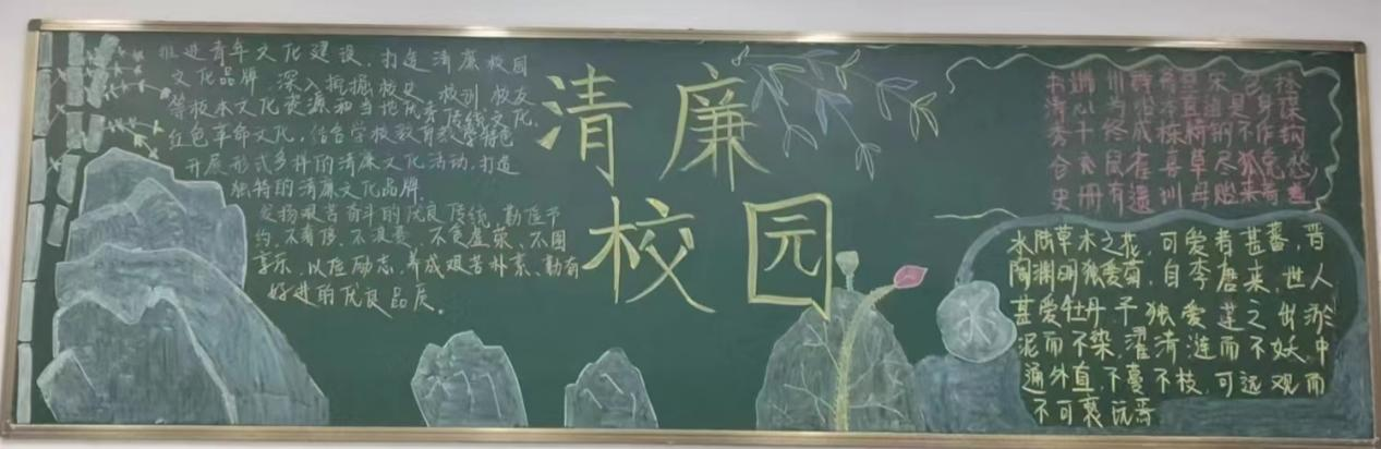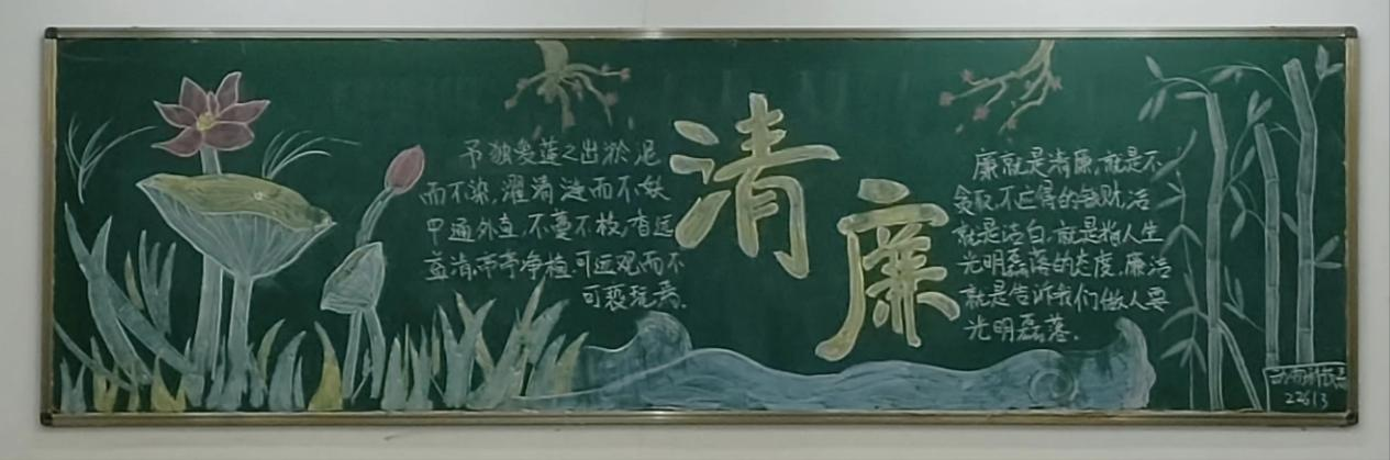 清莲盛开,出淤泥而不染;翠竹挺拔,处风寒而不凋。此次黑板报展整体布局大气,书写整齐,插图精美,不仅把清廉文化做了很好的宣传,更是把清廉校园的精气神展现了出来,在很大程度上引导全体师生进一步了解了廉洁文化,“廉洁”、“修身”的思想深入师生心中,在校园形成了“遵纪守法、廉洁自律、爱岗敬业、敬廉崇洁”的良好廉洁文化氛围。这次活动也使廉洁之花深植于学生心田,引领学生高擎敬廉崇洁之念,立下勤廉报国之志,树立“强国不必在我,但强国必定有我”的坚定信念!