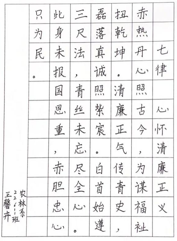 为深入学习宣传贯彻党的二十大精神,加强廉政文化建设,系部开展了以“敬廉崇洁”为主题的学生书法展、绘画展,全校师生认真欣赏了同学们的艺术作品,经全体师生匿名投票评比,优秀作品如下: