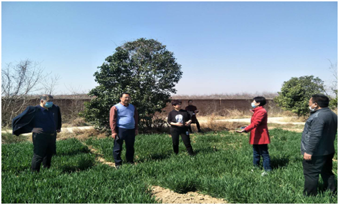 在胡建芳副教授主持的运城小麦新品种推广繁育基地,张书记查看了小麦长势,听取了农林系孙秀琴主任的汇报,并对小麦管理提出了要求。