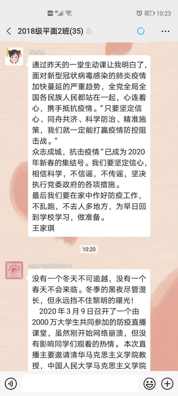 在参加完线上直播学习后,思政课教师随后在各自任课班级引导学生展开了热烈的线上讨论,大家纷纷表示通过这堂特殊的思政课,进一步明确了党中央对于疫情防控工作的决策部署,增强了中国特色社会主义道路自信、理论自信、制度自信、文化自信,坚定了打赢疫情阻击战的决心。