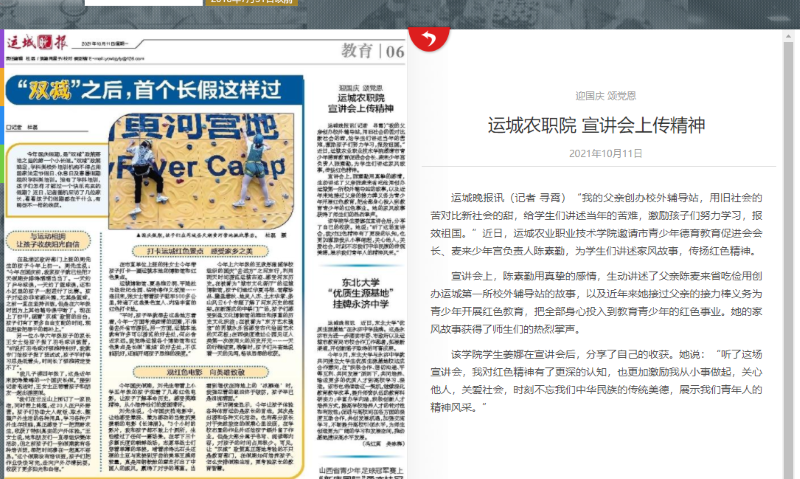 运城晚报讯(记者 寻霄)“我的父亲创办校外辅导站,用旧社会的苦对比新社会的甜,给学生们讲述当年的苦难,激励孩子们努力学习,报效祖国。”近日,运城农业职业技术学院邀请市青少年德育教育促进会会长、麦来少年宫负责人陈素勤,为学生们讲述家风故事,传扬红色精神。