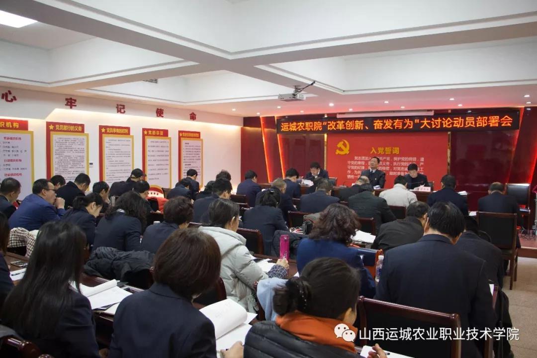 张作伟书记强调,全院上下要把开展大讨论作为一项重要政治任务,摆上重要议事日程,认真进行动员部署,迅速掀起大讨论热潮。院党委将坚决扛起主体责任,坚持问题导向,广泛宣传发动,聚焦工作任务,扎实推进大讨论深入开展。领导班子成员要落实“一岗双责”,科学组织安排,统筹抓好落实。各党支部要发挥战斗堡垒作用,广大党员干部要发挥先锋模范作用,把从严从实的要求和态度贯穿始终,为大讨论提供政治和组织保障。支部书记要履行好“第一责任人”的责任,亲自部署、亲自推动,带头解放思想、查找问题、整改提升,身体力行作出表率。院纪委要建立督促指导机制,把大讨论列入支部书记抓党建述职和部门年度目标责任考核内容。党委工作处要做好宣传报道和舆论引导工作,在全院营造解放思想、对标一流、改革创新、奋发有为的良好氛围。学院将以“改革创新,奋发有为”大讨论为契机,不忘初心,珍惜机遇,认真履职,勤奋工作,全面拓展运城农职院党的建设和党的事业新局面,为“走进新时代、建设大运城”做出新的更大的贡献。肖宁月副书记解读实施方案。