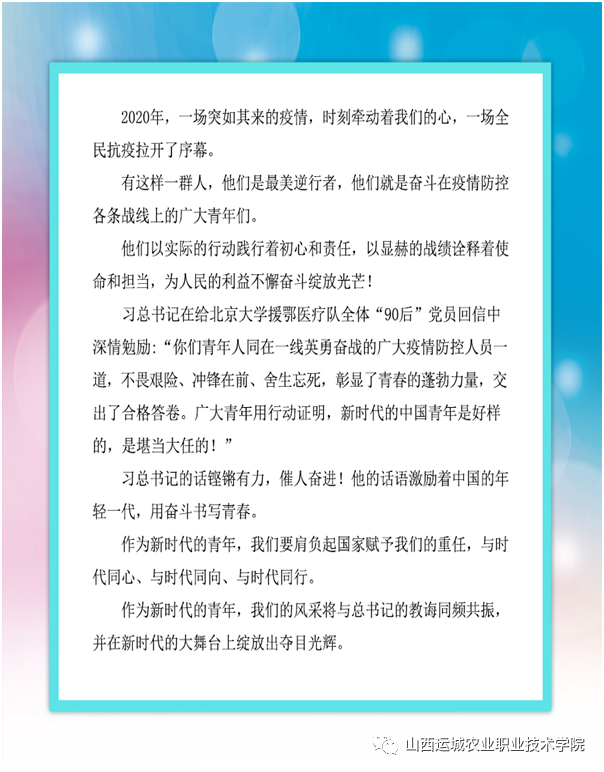 在疫情防控阻击战中,学院通过党领导人民抗击疫情的伟大实践的生动案例和鲜活素材,激发青年学生的爱国主义精神和家国情怀,教育学生用实际行动诠释青年使命,讲述战“疫”故事、传播抗“疫”精神,以行动书写青春篇章。