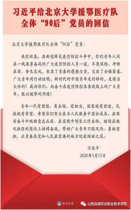 3月15日,习近平总书记给北京大学援鄂医疗队全体“90后”党员回信,向他们和奋斗在疫情防控各条战线上的广大青年致以诚挚的问候,并寄语广大青年不惧风雨、勇挑重担,“让青春在党和人民最需要的地方绽放绚丽之花”。
