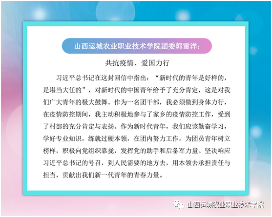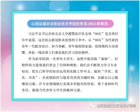 习近平总书记给北京大学援鄂医疗队全体“90”后党员的回信在农职院青年学生中反响热烈。农职院学子认真学习回信精神,互相交流,分享体会,青年倍感振奋和鼓舞,对打赢战“疫”充满信心。