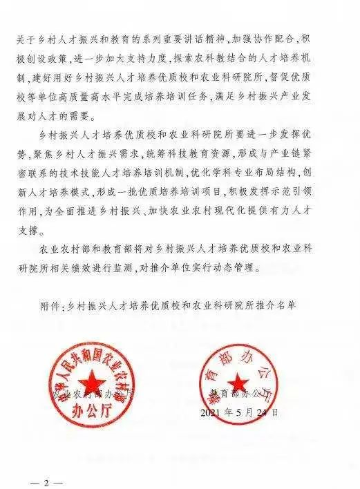 此次入围的乡村振兴人才培养优质校,是按照“广泛推荐、优中选优、引领示范”的原则遴选,经院校自荐、省级推荐、专家评审等环节产生的。乡村振兴人才培养优质校要进一步发挥优势,聚焦乡村人才振兴需求,统筹科技教育资源,形成与产业链紧密联系的技术技能人才培养培训机制,优化学科专业布局结构,创新人才培养模式,形成一批优质培养培训项目,积极发挥示范引领作用,为全面推进乡村振兴、加快农业农村现代化提供有力人才支撑。