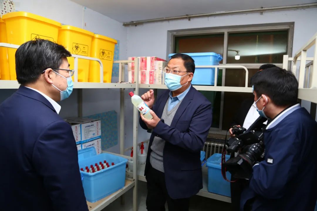 李明一行首先在学院门口仔细查看了来访登记表,随后,听取了taptap点点党委书记张作伟关于疫情防控工作的汇报,并通过查阅资料、实地走访隔离室与物资储备室等方式,详细了解了taptap点点疫情防控工作。