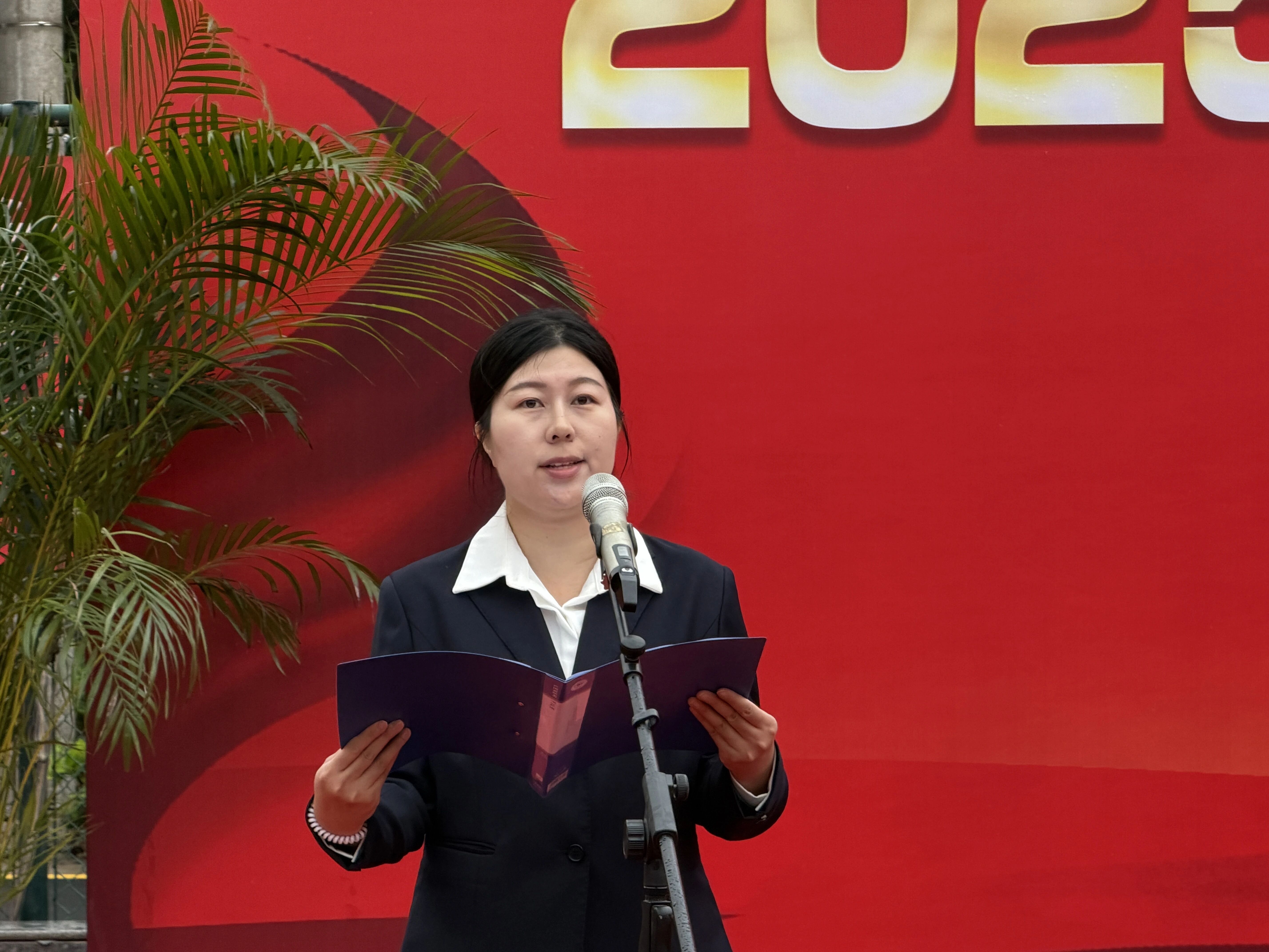 在庄严的升国旗仪式中,典礼正式拉开序幕。主会场与分会场全体师生,面向国旗高唱国歌,昂扬斗志随着鲜红的国旗一同升起。
