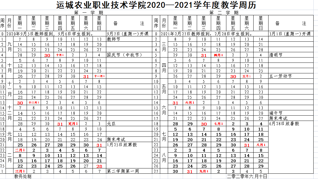 运城农业职业技术学院2020-2021学年度教学周历