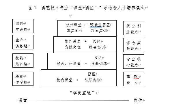 “课堂+园区”人才培养模式,以工学结合为切入点,实施项目化教学,通过工学交替,使学生能力层层递进。“课堂”指校内和基地的理论教学,“园区”指校内外实训基地的实践教学。
