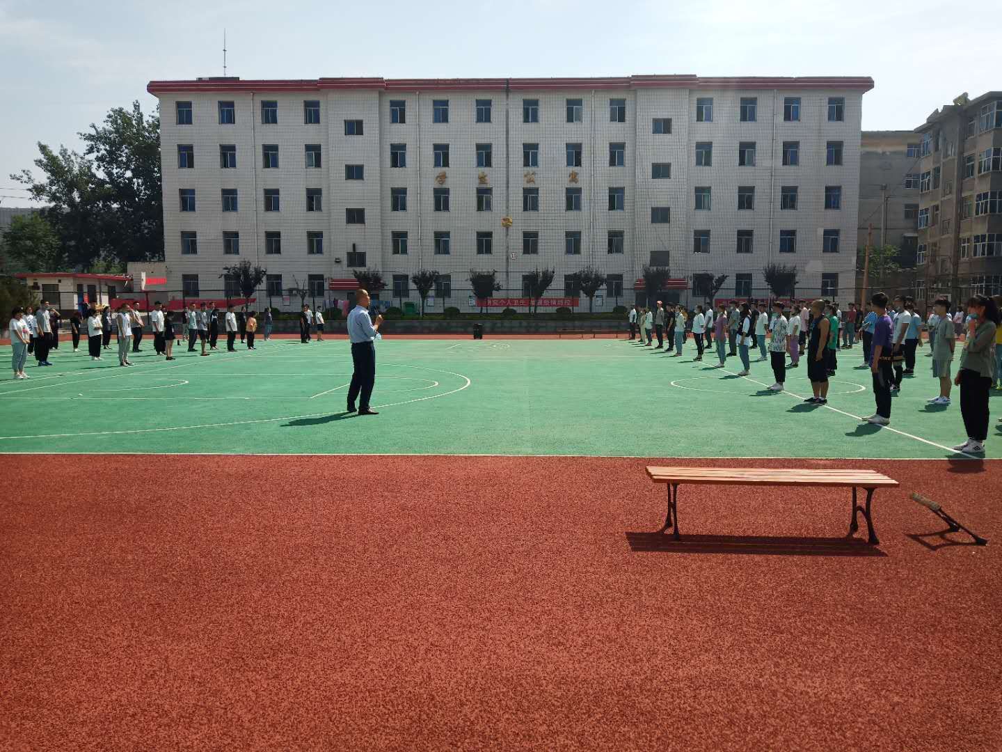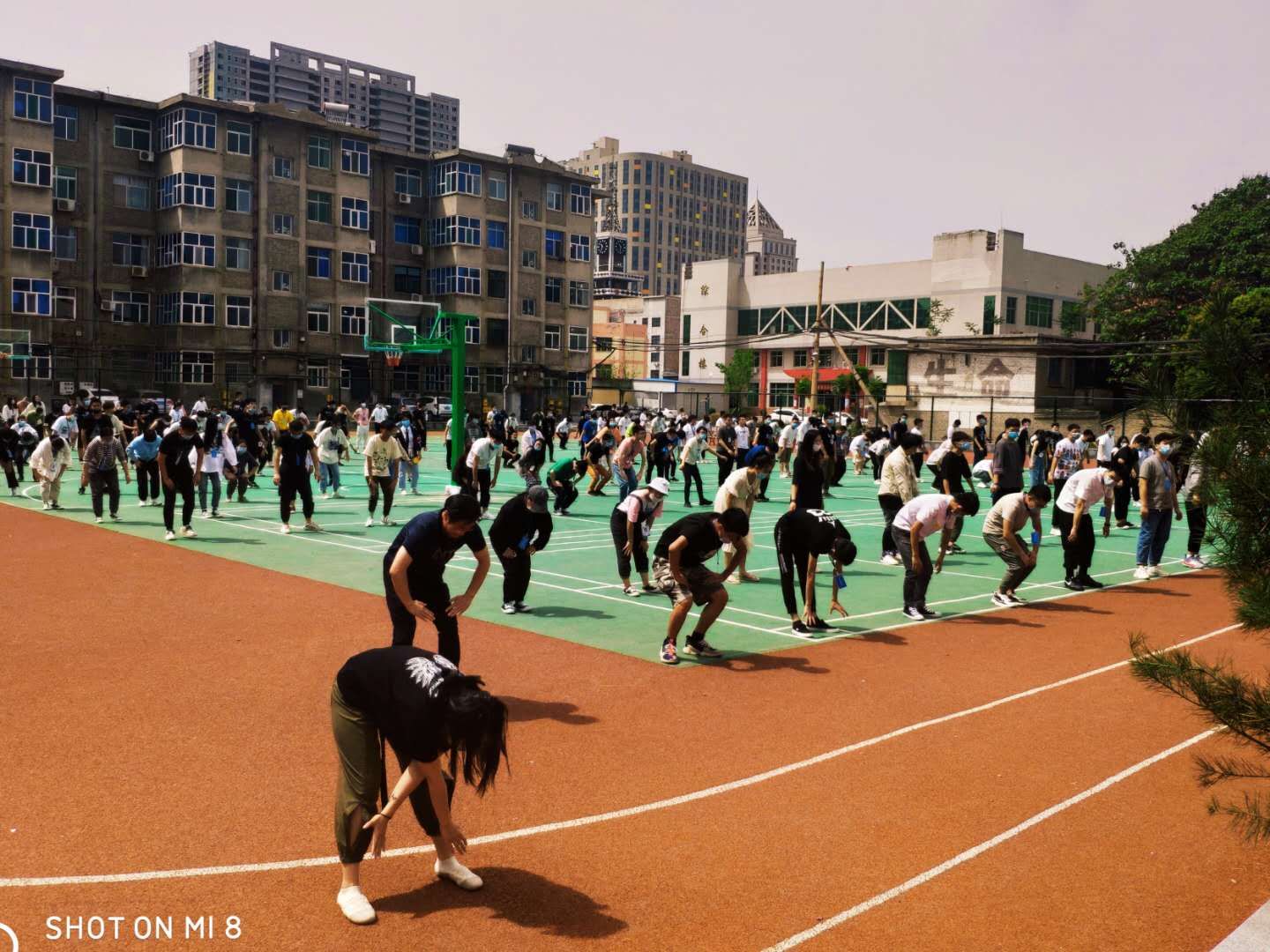 图为学生老师在进行课间操运动