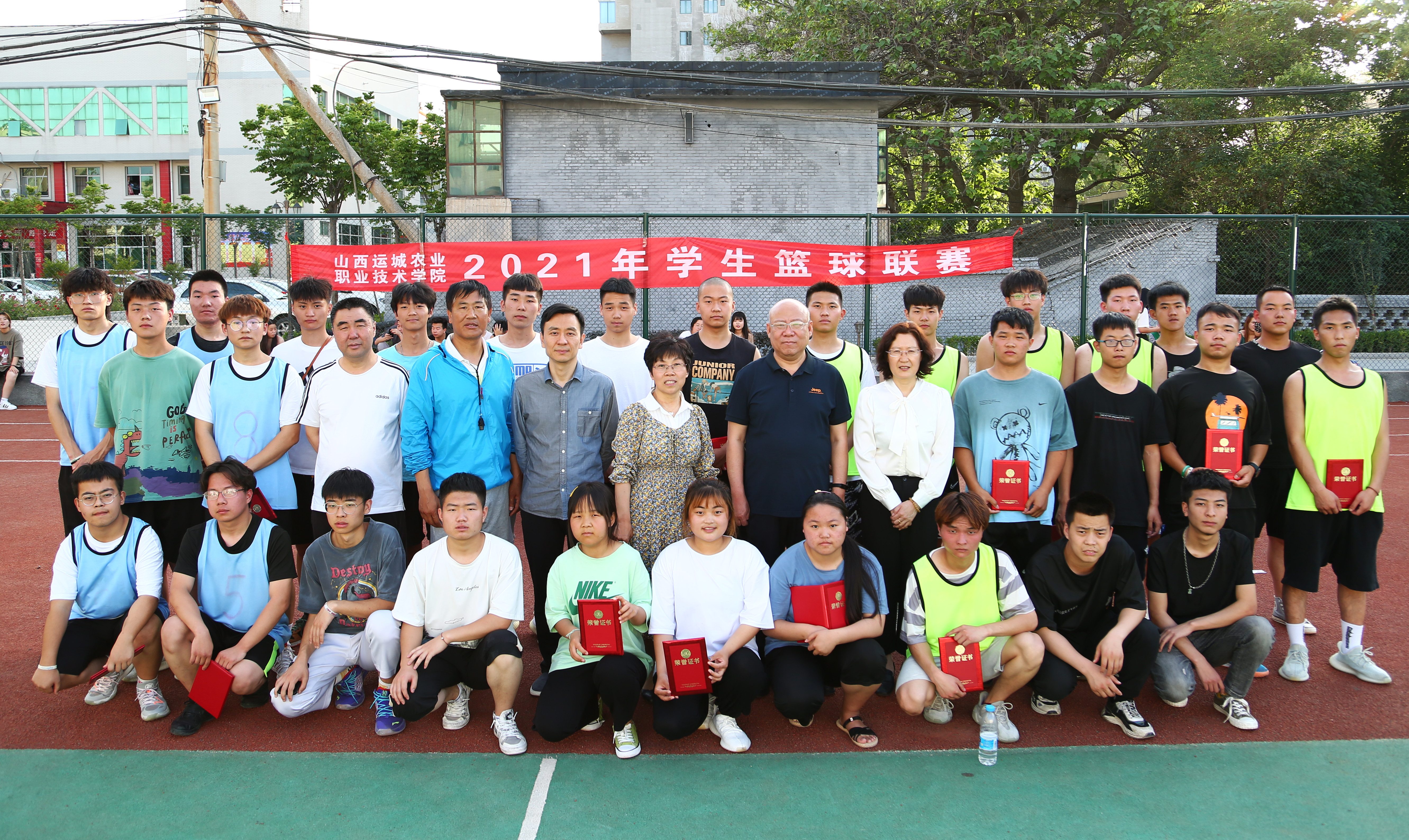 图为篮球赛参赛运动员和各系领导合影留念