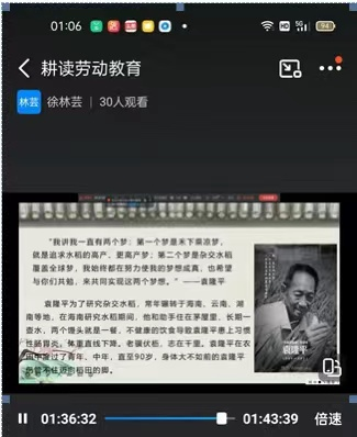 耕读劳动教育理论课在劳动周如期开展。老师们深入浅出的就如何辛勤劳动和诚实劳动进行了别开生面的讲座,同学们听得津津有味。图(三)为徐林芸副教授在给学生们讲解如何做新时代的劳动践行者。图(四)为林琳副教授在给学生们介绍中华儿女自强不息,用劳动创造了生活、创造了灿烂文化的场景。图(五)为张雷副教授在给学生们介绍诚实劳动的时代价值。图(六)为侯林洁讲师在给学生们深层次的剖析诚信的定义。图(七)为吕树强讲师在给学生们讲解如何做一位诚实劳动的践行者。
