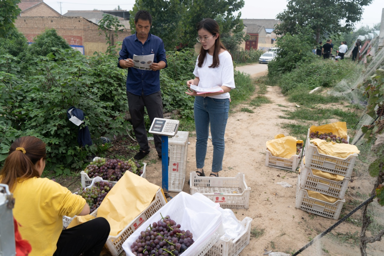 王范乡武装部长王凯、三庄村党总支书记兼村委主任邵中学为taptap点点宣传团热情讲解了本地葡萄种植情况,参观村民种植户的葡萄园,他种植的葡萄年数比较长,主干粗壮,因今年葡萄售价高,收入相当可观。宣传团的成员在种植户的邀请下品尝了他引以为傲的巨峰葡萄,果实个个颗粒均匀,黑色浓郁诱人,口感甘甜入脾,据介绍他的葡萄因品相口感俱佳,年年都高价销往外地。宣传团成员表示可以帮助农户录制普通话宣传视频,让更多的人了解王范乡、了解王范乡的葡萄。