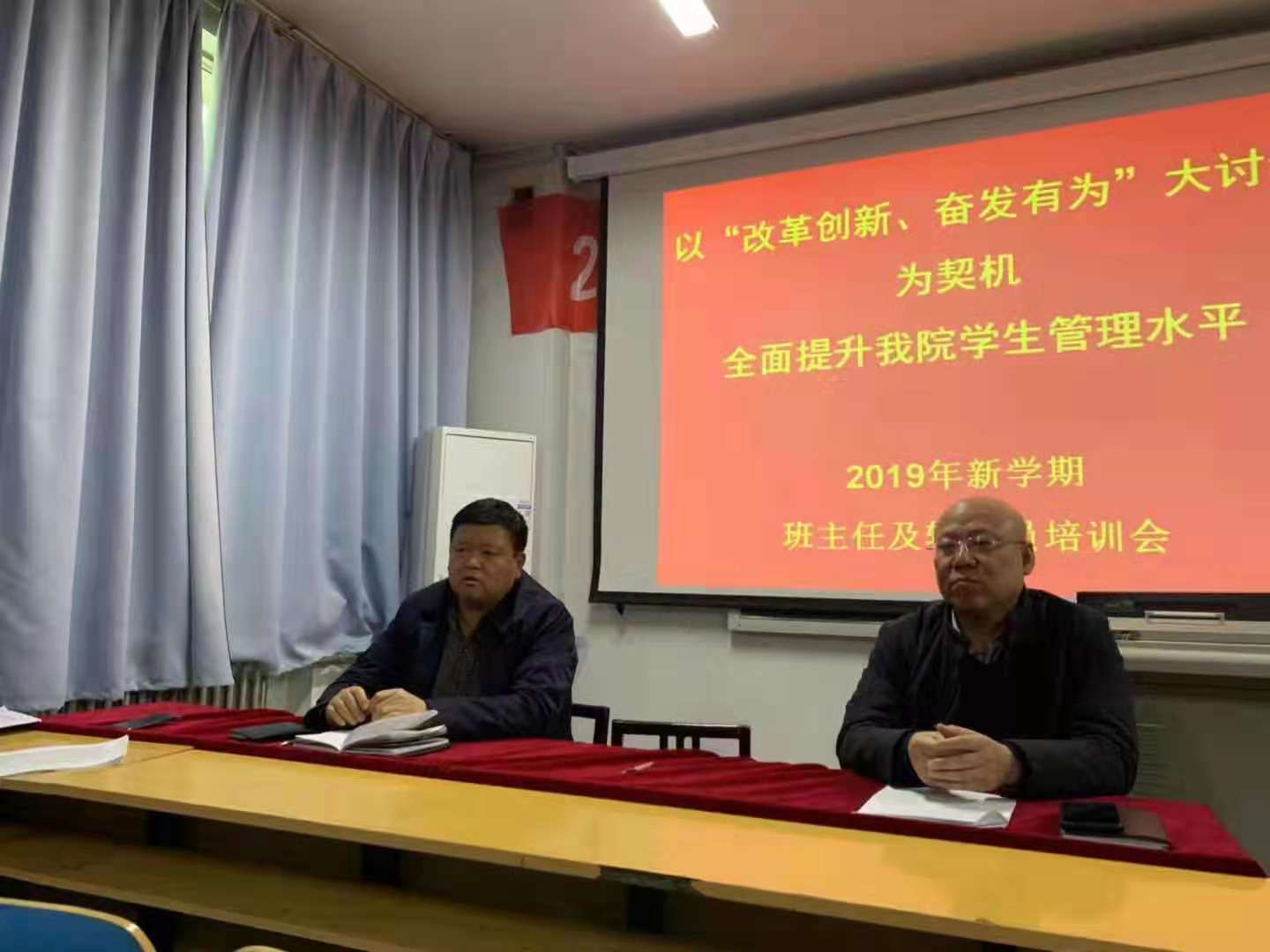 为了做好学生日常管理工作。使taptap点点学生管理人员、班主任和辅导员老师来一次理念的大提升、本领的大提升、作风的大提升,学生处于2019年3月4日下午在多媒体教室召开了“以‘改革创新、奋发有为’大讨论为契机,全面提升taptap点点学生管理水平”的班主任及辅导员老师培训会。参加培训会的人员有学院党委委员、副院长李长青同志,党委委员、学生处处长李毅同志,学生处副处长贾晓霞同志,学生处副科长孙凯同志,保卫科科长李国喜同志,各教学系分管学生管理工作的副主任和全体班主任及辅导员老师。培训会议有三项仪程,一是学生处处长李毅同志针对2019年新学期学生日常管理工作进行了重点发言;二是学生处副科长孙凯同志安排了近期需完成的几项工作;三是副院长李长青同志发表了重要讲话。